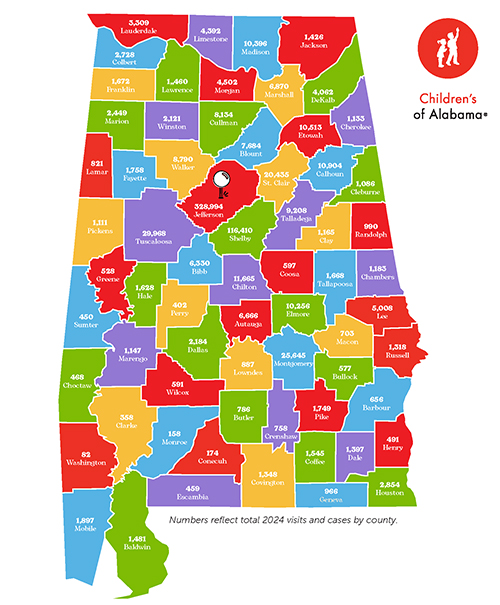 Since 1911, Children’s of Alabama has provided specialized medical care for ill and injured children. Ranked among the best children’s hospitals in the nation by U.S. News & World Report, Children’s serves patients from every county in Alabama and nearly every state. With more than 3.5 million square feet, it is one of the largest pediatric medical facilities in the United States. Children’s offers inpatient and outpatient services at its Russell Campus on Birmingham’s historic Southside with additional specialty services provided at Children’s South, Children’s on 3rd Outpatient Center, and in Huntsville and Montgomery. Primary medical care is provided in more than a dozen communities across central Alabama. Children’s is the only health system in Alabama dedicated solely to the care and treatment of children. It is a private, not-for-profit medical center that serves as the teaching hospital for the University of Alabama at Birmingham (UAB) pediatric medicine, surgery, psychiatry, research and residency programs. The medical staff consists of UAB faculty and Children’s full-time physicians as well as private practicing community physicians. Children’s treats all children, regardless of their family’s ability to pay. Children’s believes in family-centered care and offers child life, social services, pastoral care and other programs to help meet patients’ unique needs.
